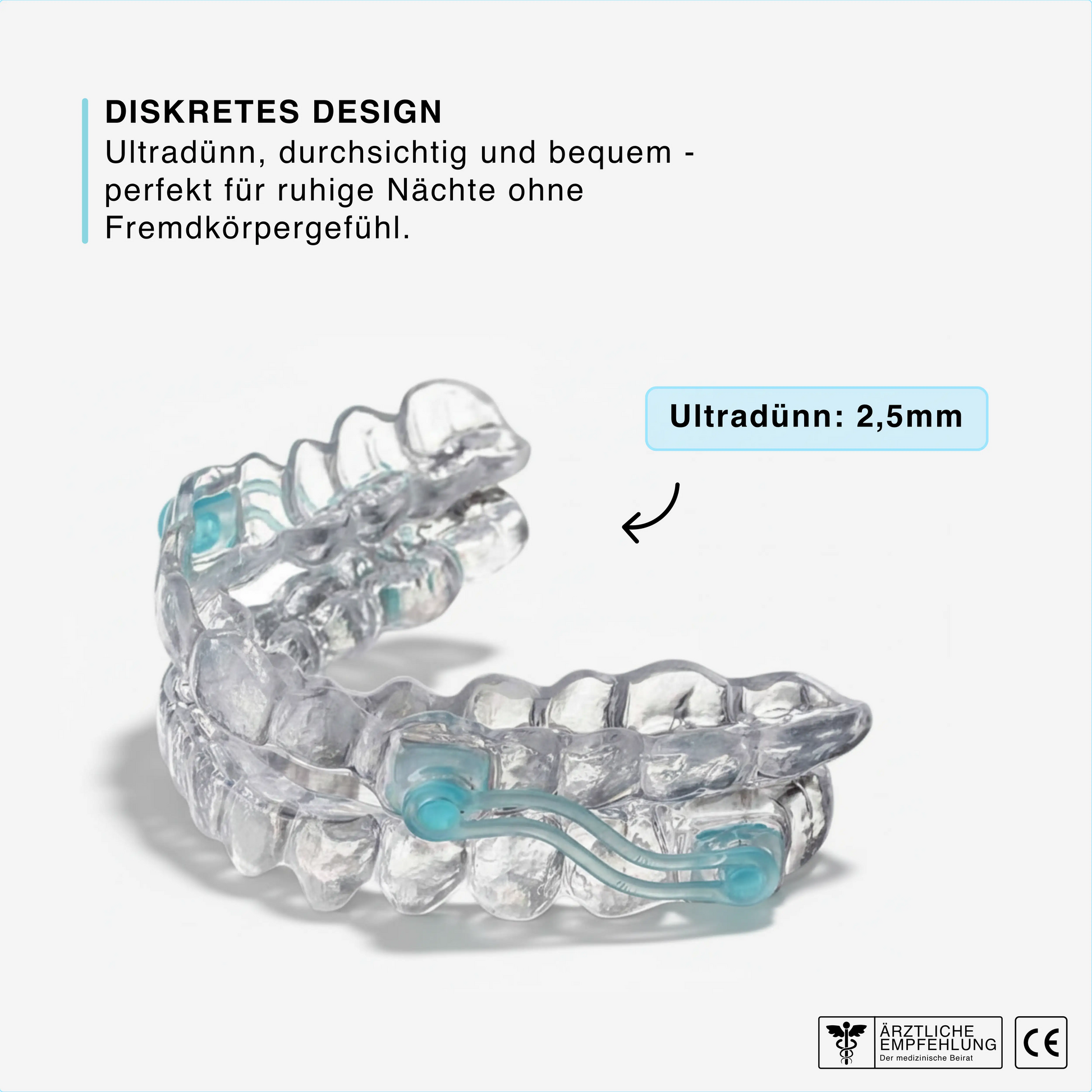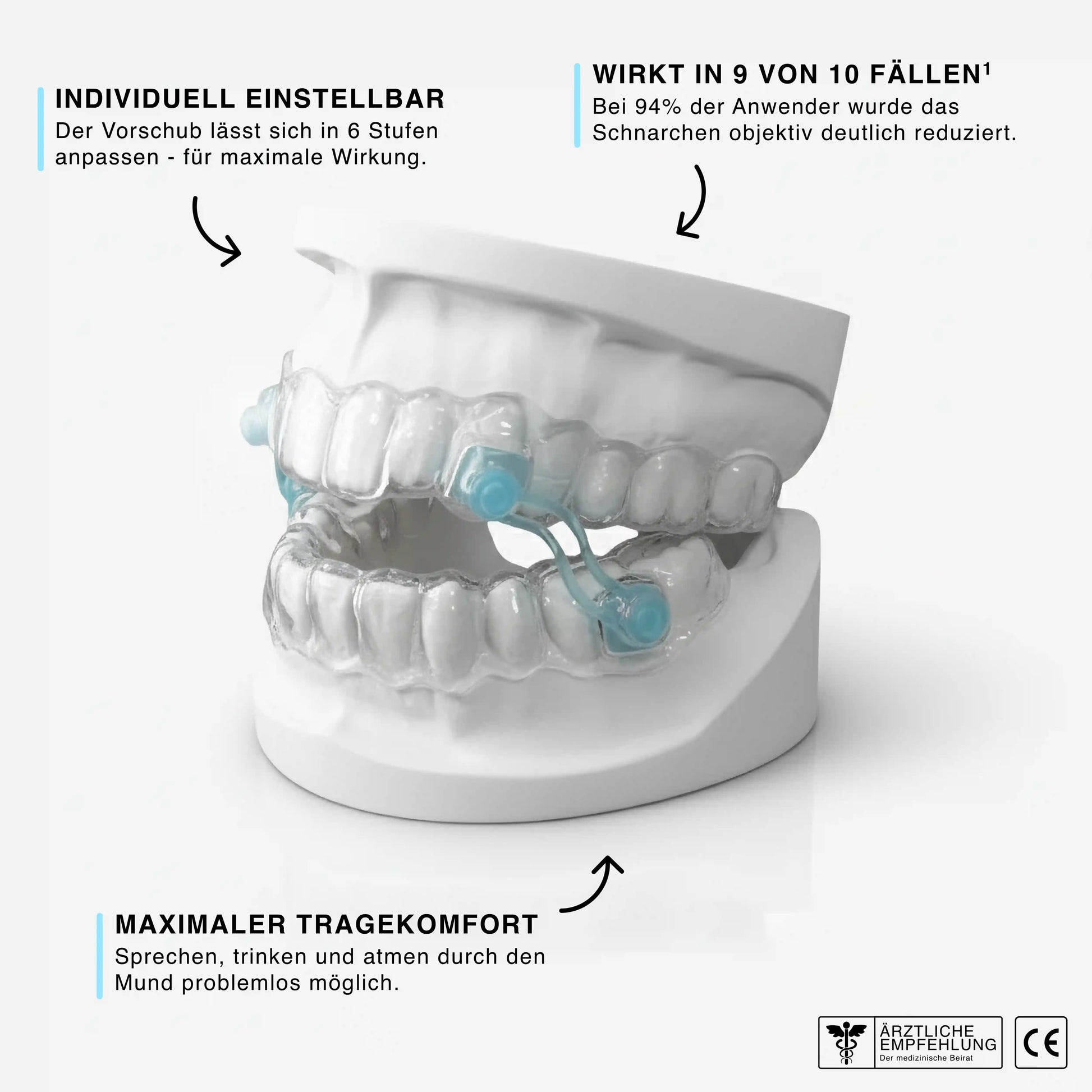 Die Schnarchschiene verlagert den Unterkiefer sanft nach vorn. Dadurch wird der Rachenraum erweitert und die Weichteile flattern weniger oder gar nicht mehr – genau das verhindert das typische Schnarchgeräusch. Diese Methode ist medizinisch anerkannt und wird auch von Schlafmedizinern und Zahnärzten empfohlen – besonders bei sogenanntem „primärem Schnarchen“.